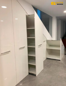 Aprovechar el espacio en una vivienda, puede ser algo especialmente importante y útil para nuestra vida cotidiana. Si además conseguimos hacerlo de manera elegante, aportando estilo a nuestro espacio y a la vez con un enfoque funcional y práctico, el resultado puede ser de lo más satisfactorio. Esa es la propuesta que hacer Garma a sus clientes, trabajos a medida que superan los mayores retos de espacio y dan una solución orientada a mejorar su hogar o espacio. En nuestro taller de carpintería, diseñamos armarios y frentes de armario de manera personalizada, y cubriendo las necesidades más exigentes de nuestros clientes. Este el caso de este armario diseñado para un cliente de Madrid, pensado para aprovechar al máximo el hueco de una escalera, con cajones extraíbles de fondo especial y lacado de alto brillo. Una manera eficaz de potenciar su posibilidad de almacenamiento sin necesidad de mermar su espacio y aportando un toque de estilo a un rincón sin utilidad previa. Solo un ejemplo de las infinitas posibilidades que podemos ofrecer en nuestros proyectos de carpintería a medida. Seguimos mejorando hogares.
