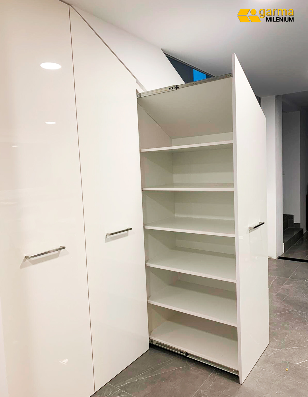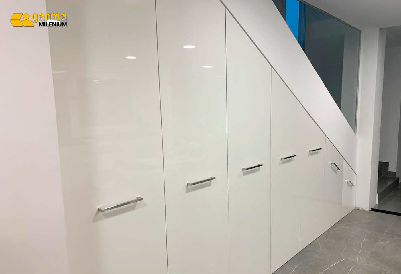 Aprovechar el espacio en una vivienda, puede ser algo especialmente importante y útil para nuestra vida cotidiana. Si además conseguimos hacerlo de manera elegante, aportando estilo a nuestro espacio y a la vez con un enfoque funcional y práctico, el resultado puede ser de lo más satisfactorio. Esa es la propuesta que hacer Garma a sus clientes, trabajos a medida que superan los mayores retos de espacio y dan una solución orientada a mejorar su hogar o espacio. En nuestro taller de carpintería, diseñamos armarios y frentes de armario de manera personalizada, y cubriendo las necesidades más exigentes de nuestros clientes. Este el caso de este armario diseñado para un cliente de Madrid, pensado para aprovechar al máximo el hueco de una escalera, con cajones extraíbles de fondo especial y lacado de alto brillo. Una manera eficaz de potenciar su posibilidad de almacenamiento sin necesidad de mermar su espacio y aportando un toque de estilo a un rincón sin utilidad previa. Solo un ejemplo de las infinitas posibilidades que podemos ofrecer en nuestros proyectos de carpintería a medida. Seguimos mejorando hogares.