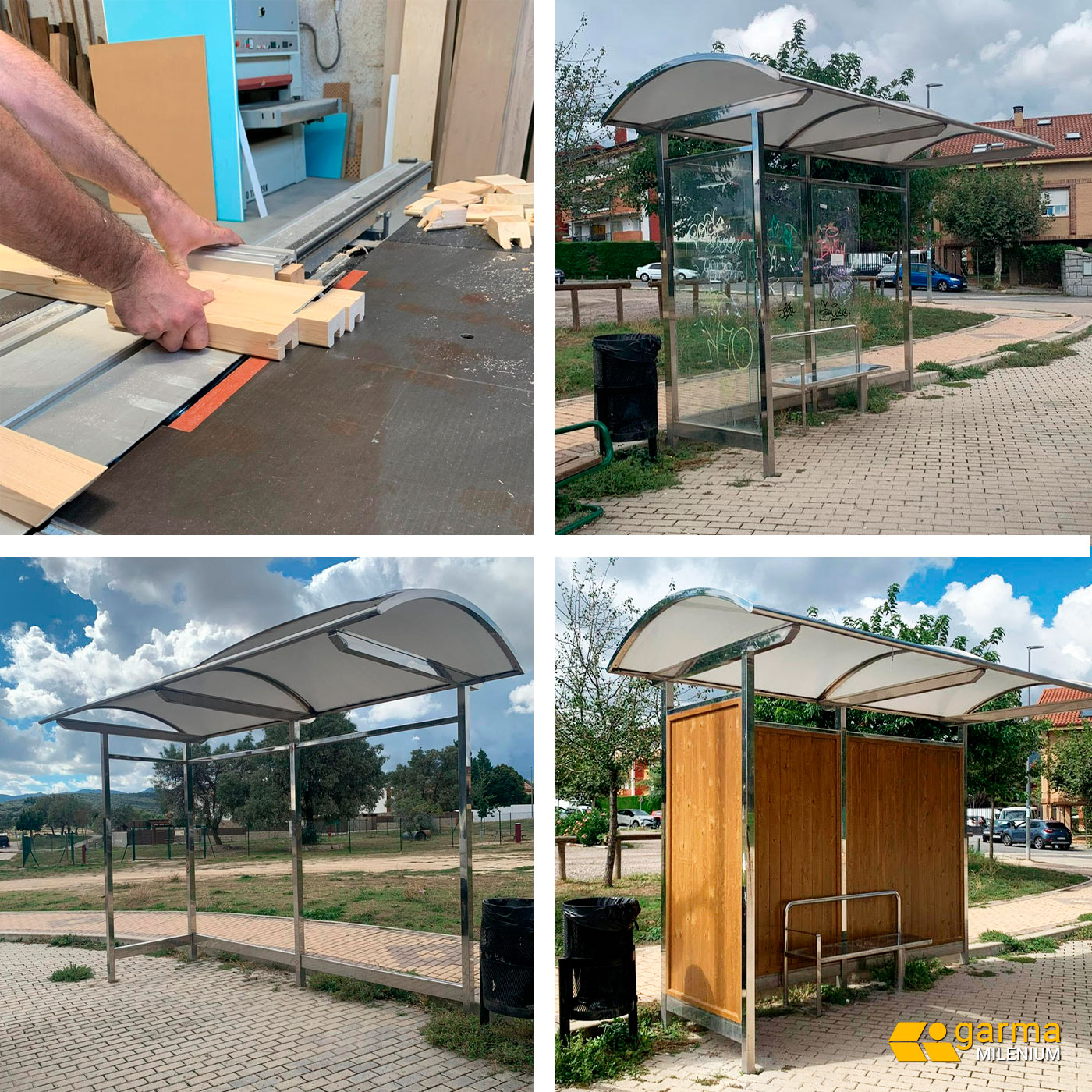 En estas instalaciones se ha procedido a sustituir el cristal por tablas de madera elaboradas en nuestros talleres con un tratamiento antigrafiti, que además de tener un enfoque más respetuoso con el medio ambiente, mejoran sensiblemente la estética y hacen que estos puntos resulten más agradables a los vecinos.