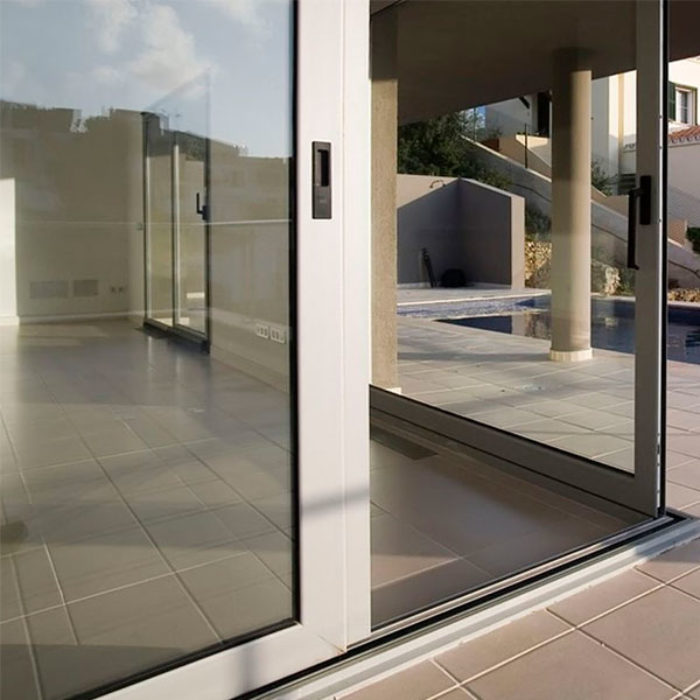 Sistema de puerta corredera con Rotura de Puente Térmico y con estética achaflanada o curva en hojas y junquillos.